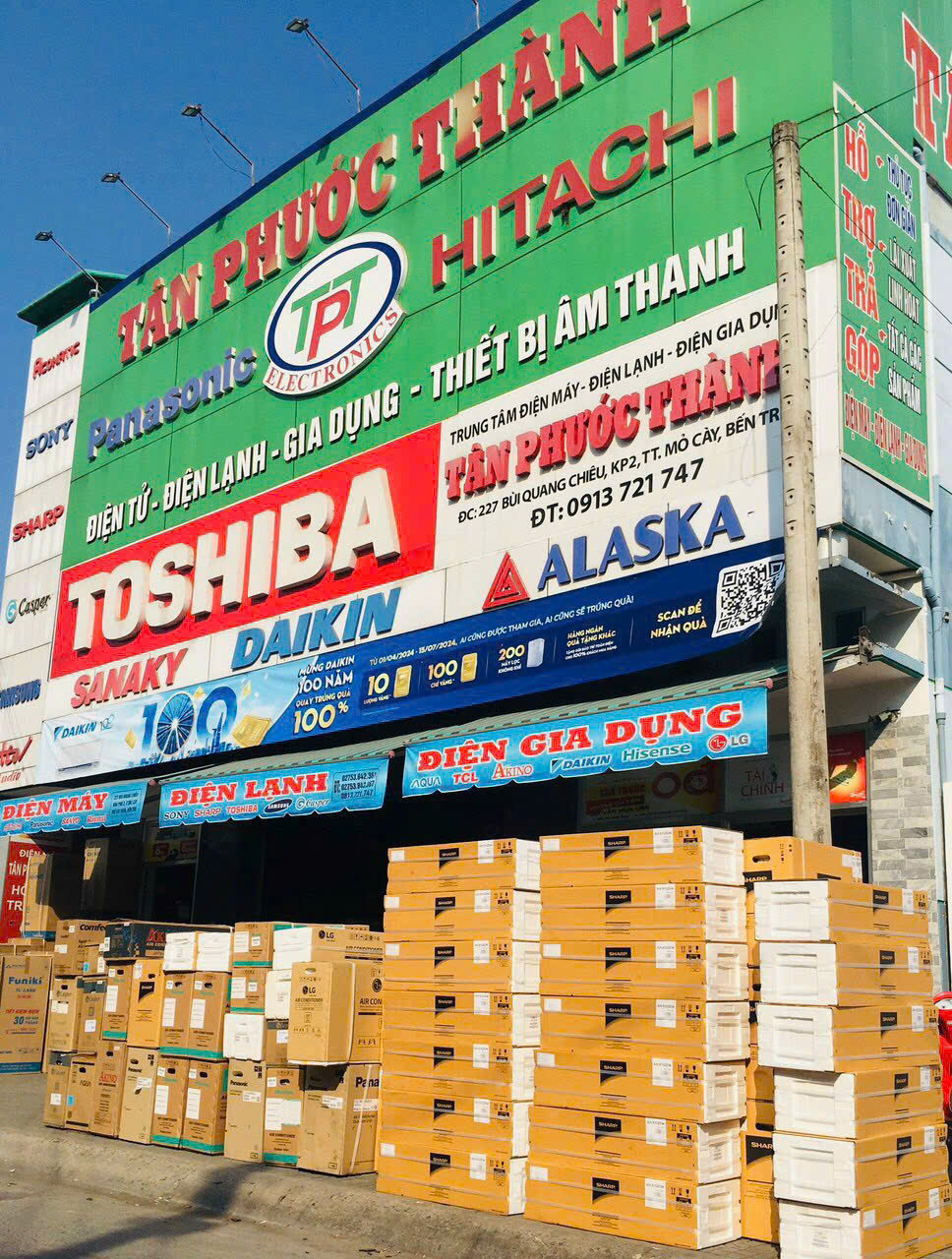 CÔNG TY TNHH TM TÂN PHƯỚC THÀNH – BẾN TRE với vị trí thuận lợi ngay trung tâm xã Mõ Cày- Bến Tre rất thuận tiện cho việc mua sắm của tất cả người tiêu dùng trong khu vực. Đặt lợi ích người tiêu dùng lên hàng đầu, chúng tôi đã tuyển chọn kỹ lưỡng nhất từ những thương hiệu nổi tiếng hàng đầu thế giới như: SHARP, SONY, LG, SAMSUNG, PANASONIC, TOSHIBA, HITACHI, AQUA ,RINNAI, COMFEE, MITSUBISHI… với hơn 3000 loại sản phẩm đa dạng phân khúc từ cơ bản- tầm trung cho đến cao cấp, model mới nhất thị trường , những sản phẩm độc quyền nhập chính hãng, cùng chính sách bảo hành- bảo trì theo tiêu chuẩn nhà sản xuất và phương thức mua hàng chuyên nghiệp tiên tiến nhất .