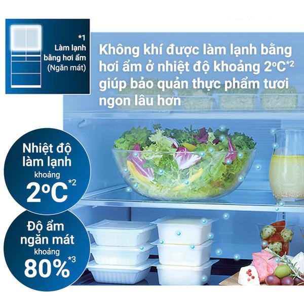 🔷 Cơ chế: Khác với các dòng tủ lạnh thông thường làm khô thực phẩm bằng luồng khí lạnh trực tiếp, Hitachi sử dụng hệ thống làm lạnh gián tiếp với độ ẩm cao. Luồng khí lạnh được làm ẩm trước khi luân chuyển khắp ngăn mát.