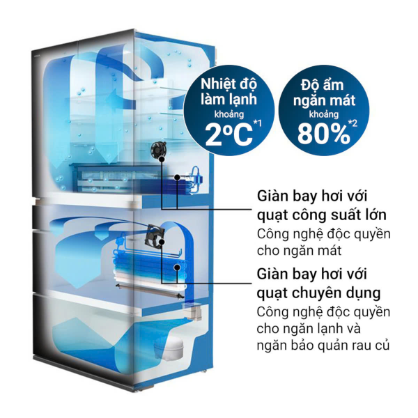 🔷 Hệ thống quạt kép giúp làm lạnh độc lập và hiệu quả cho cả ngăn lạnh và ngăn đá. Kết hợp với Bộ đôi Cảm biến nhiệt Eco cho từng ngăn, tủ lạnh có khả năng làm lạnh cực mạnh nhưng vẫn tiết kiệm điện năng tối ưu.