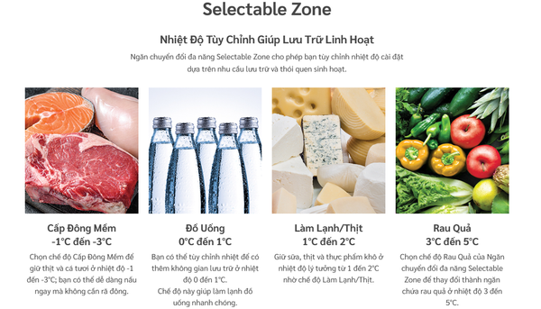 🔷 Rau Quả (3°C đến 5°C): Chọn chế độ Rau Quả của Ngăn chuyển đổi đa năng Selectable Zone để thay đổi thành ngăn chứa rau quả ở nhiệt độ 3 đến 5°C.